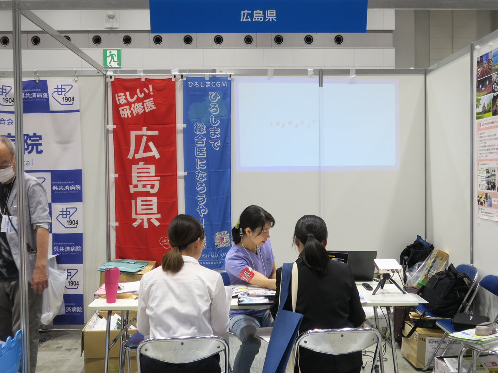 広島県のブースには医学生33名(のべ45名)および初期研修医1名が訪れ、特に5年生からの関心が高く、広島県における総合診療の取り組みや、今後の医師キャリアについて熱心に耳を傾けてくださいました。