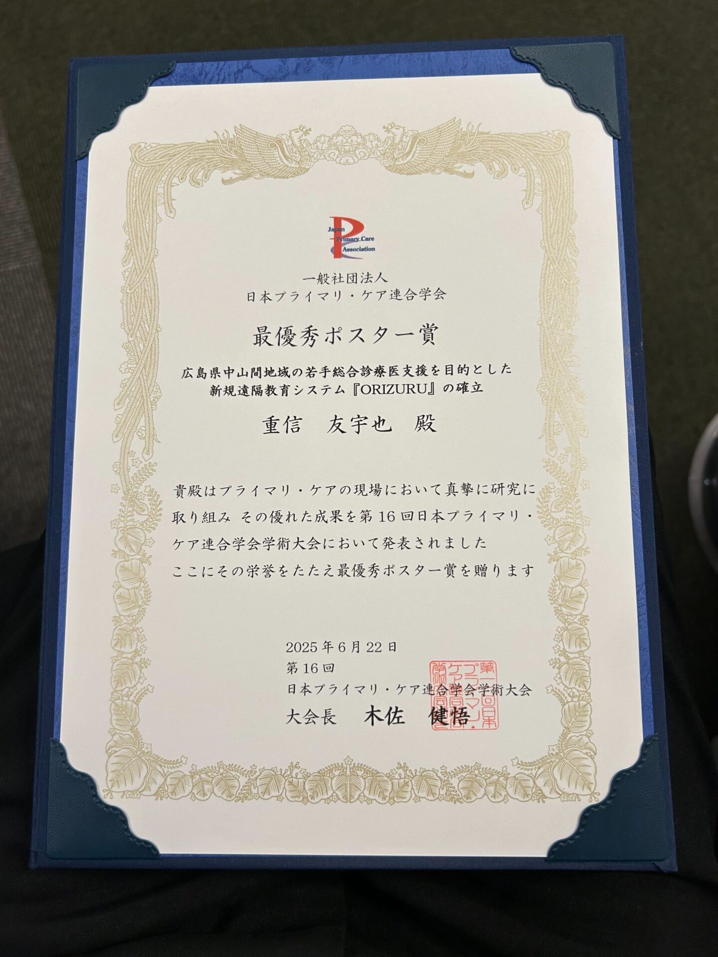 第16回 日本プライマリ・ケア連合学会で重信友宇也先生が『最優秀ポスター賞』を受賞