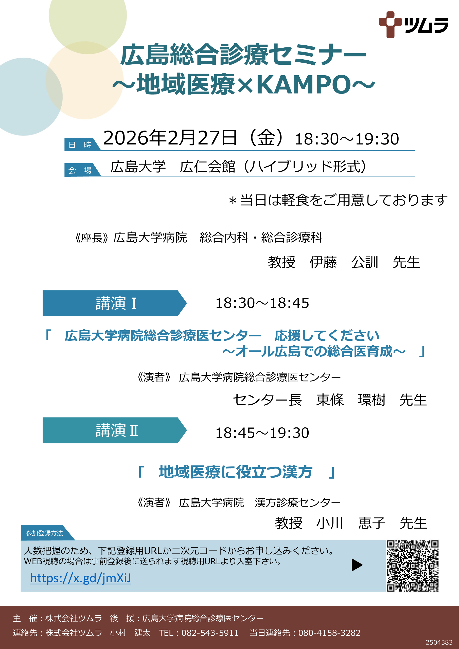 「広島総合診療セミナー ~地域医療×KAMPO~」を開催いたします。 【開催概要】 日 時:2026年2月27日(金)18:30~19:30 会 場:広島大学 広仁会館(ハイブリッド開催) ※当日は軽食をご用意しております。 【プログラム】 座長 広島大学病院 総合内科・総合診療科 教授 伊藤 公訓 先生 講演Ⅰ(18:30~18:45) 「広島大学病院総合診療医センター 応援してください ~オール広島での総合医育成~」 演者:東條 環樹 先生 (広島大学病院 総合診療医センター長) 講演Ⅱ(18:45~19:30) 「地域医療に役立つ漢方」 演者:小川 恵子 先生 (広島大学病院 漢方診療センター 教授) 【参加申込】 参加をご希望の方は、以下のURLよりお申し込みください。 https://x.gd/jmXiJ 医学生、研修医をはじめ、地域医療や総合診療に関心のある多くの皆さまのご参加をお待ちしております。